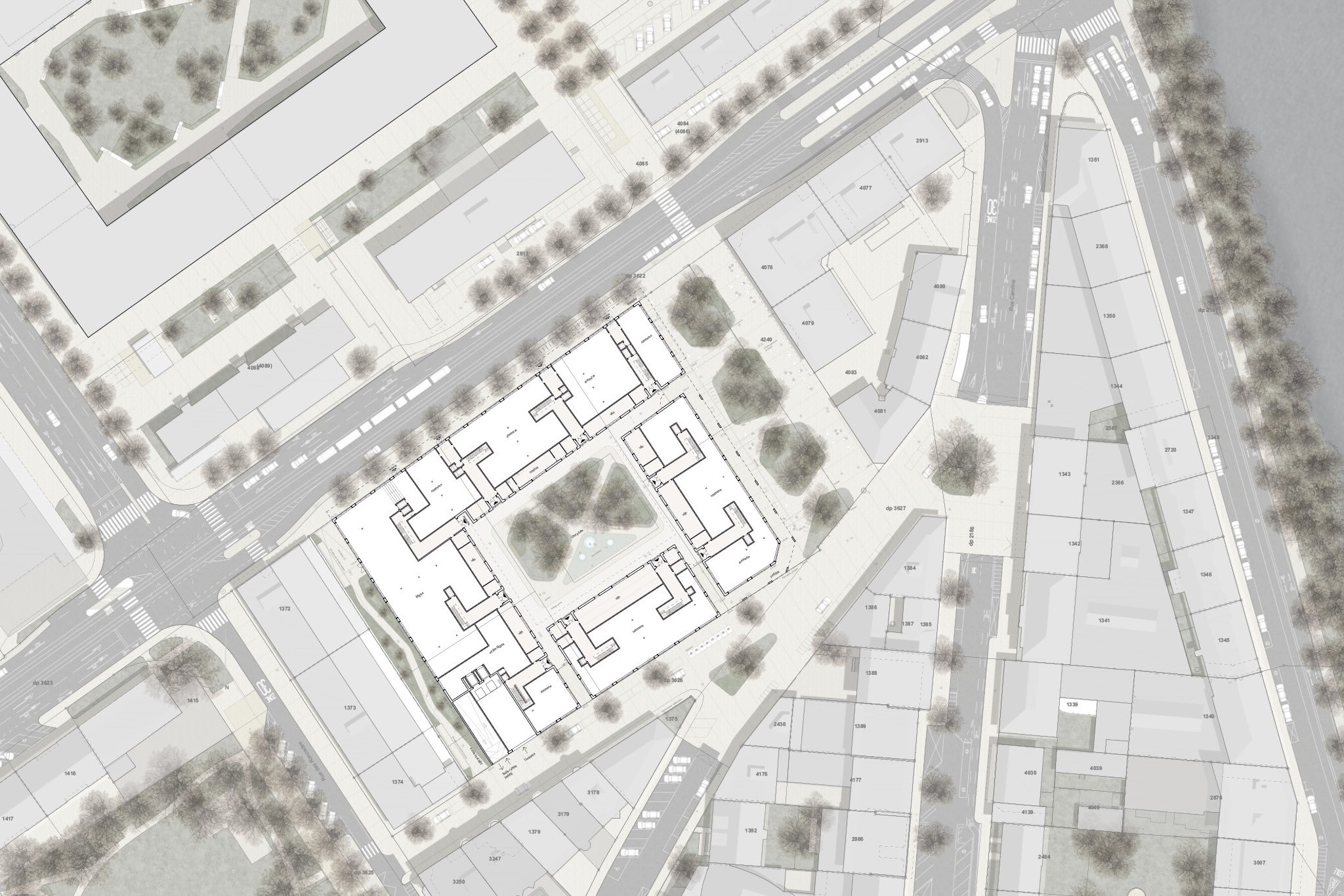 Logements locatifs et étudiants, commerces, parking sur 51’000 m2 SBP