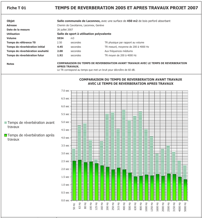 Après l’exécution des travaux, la salle réverbère de manière nettement moindre puisque le temps de réverbération a été diminué de plus de 3 x (temps de réverbération de 1.74 secondes), ce qui est nettement sensible pour les utilisateurs (voir fiche de mesure avant et après travaux).